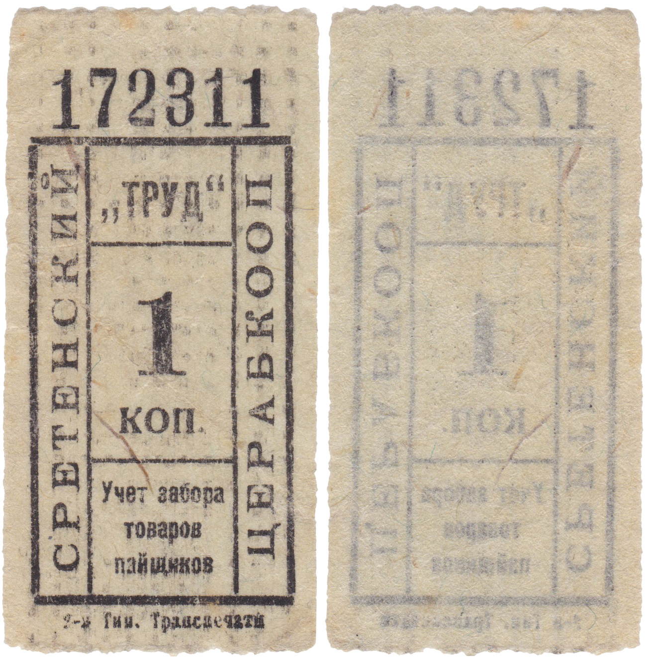 Bonus to a cooperative member for goods withdrawal 1 Kopeck 1919. Sretensky Central Workers’ Cooperative “Trud” (Tserabkoop), Zabaykalsky Oblast