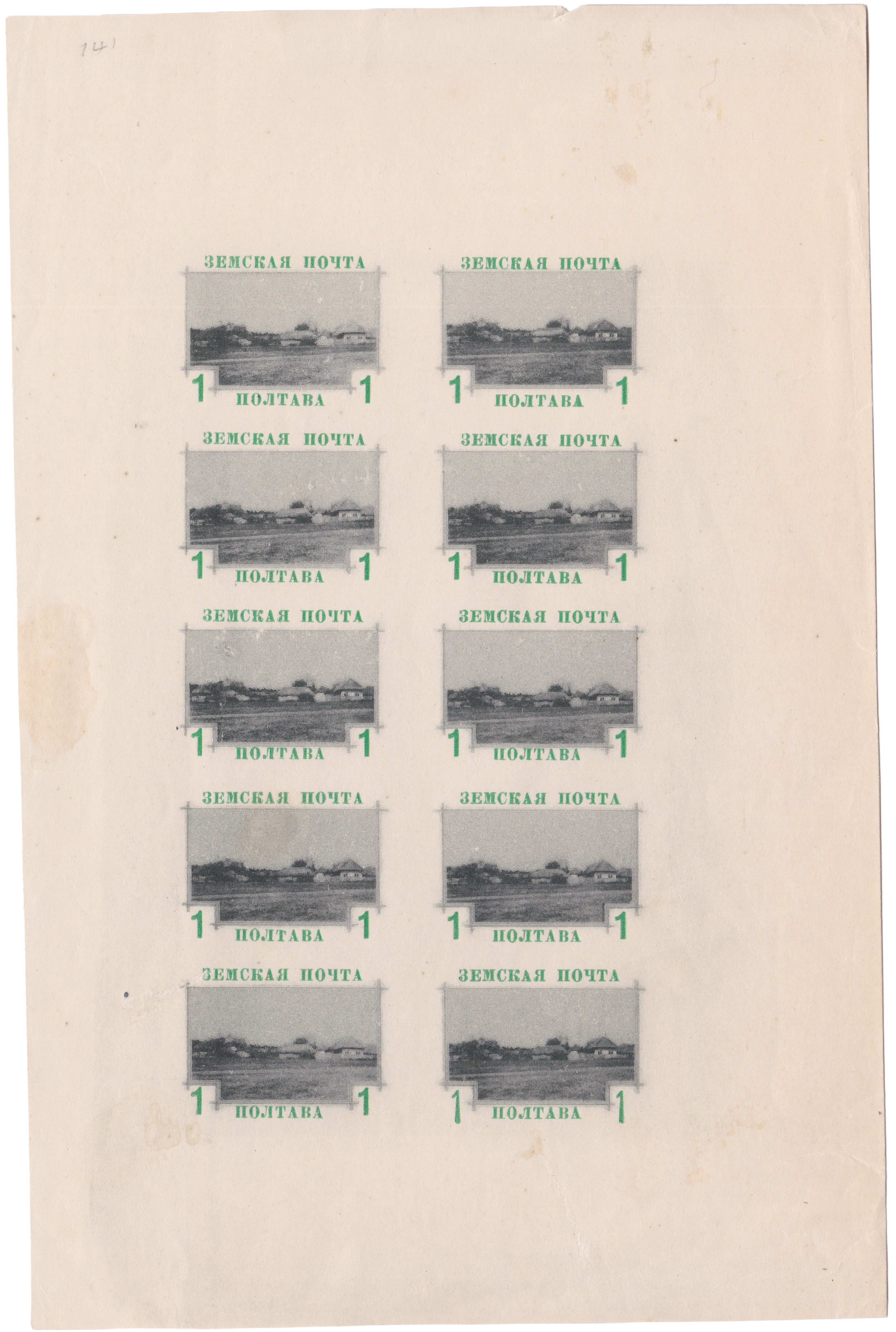 The design of the Poltava Uyezd zemstvo post stamps of 1912 depicts a village street in the village of Hetmanshchyna, Vasylkiv Uyezd, and was produced as a photoreproduction at the Kulzhenko printing house in Kyiv. The typographic version was printed at Podzemsky's typolithography in Poltava, and the numerals were applied by hand stamp at the Zemstvo administrative office.
