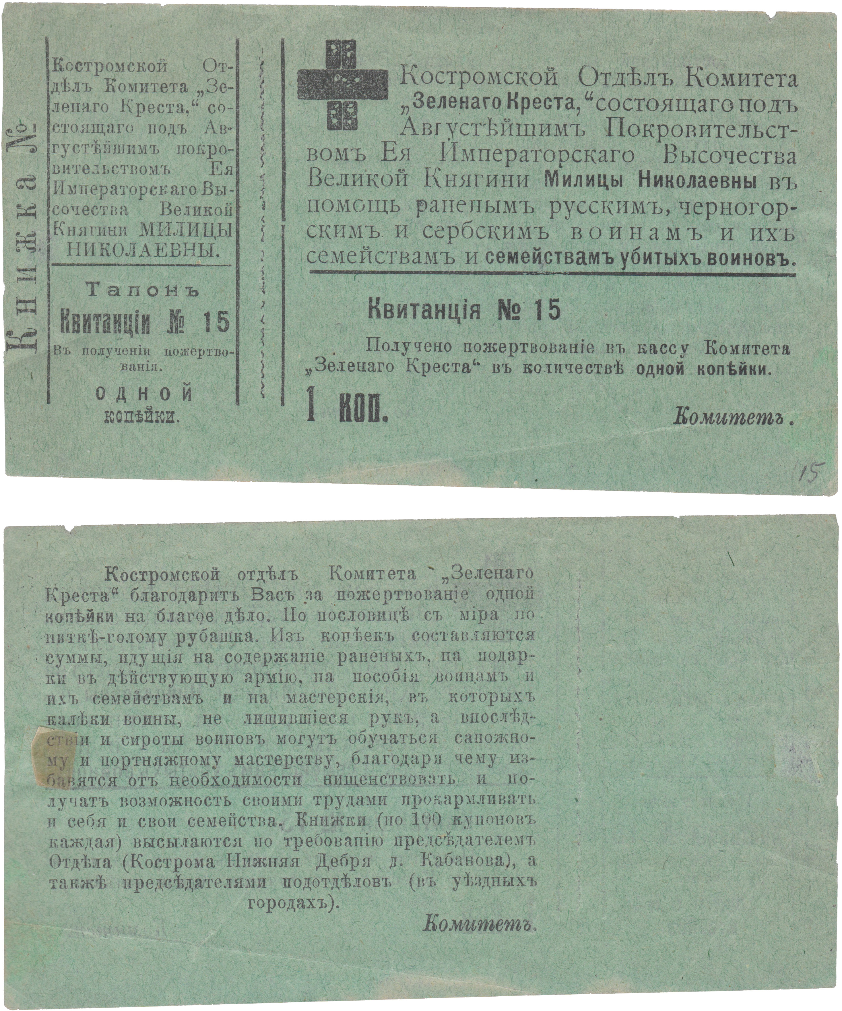 Получено пожертвование в кассу Комитета "Зеленаго креста" в количестве 1 Копейка 1914 год.