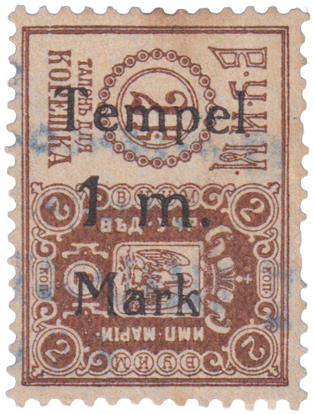 Надпечатка Tempel 20 m. Mark на Судебная пошлина 1 Копейка 1918 год.